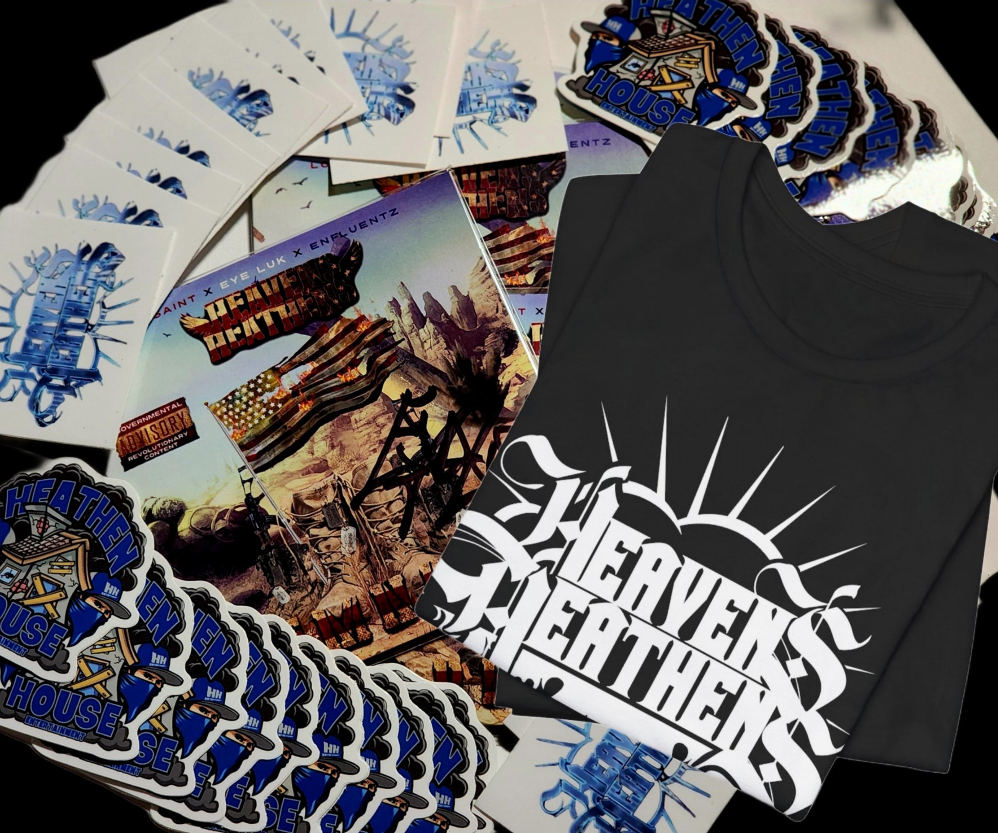 An anniversary addition autographed Remnant album with a 100% cotton Heavens Heathens high quality vinyl printed T-shirt and sticker pack combo!